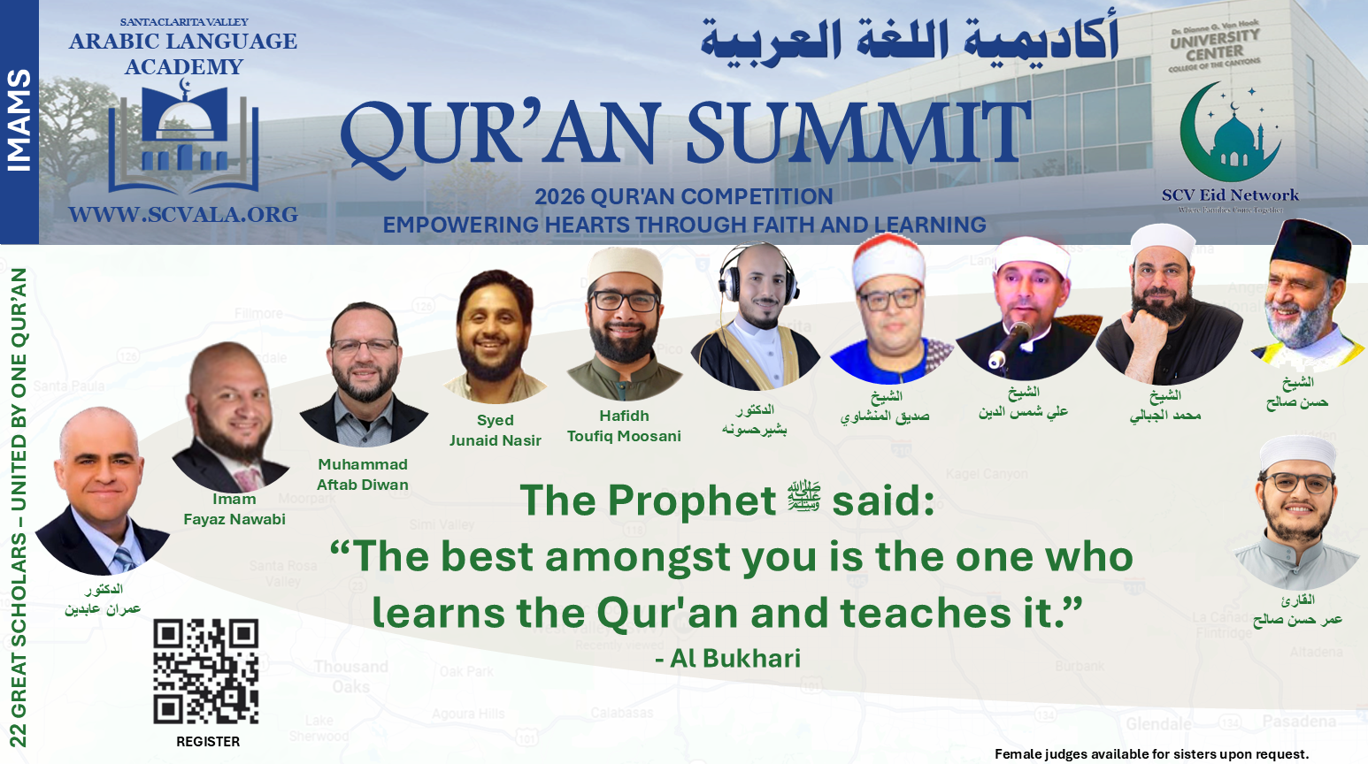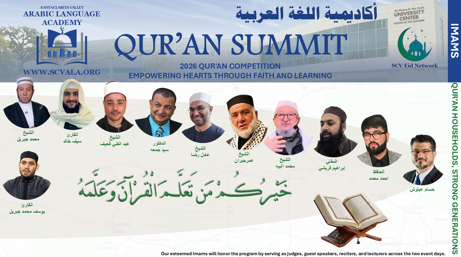 Qur’an Summit is a regional Qur’an competition hosted by Santa Clarita Valley Arabic Language Academy (SCV ALA), focused on nurturing love of the Qur’an, strengthening memorization and recitation, and uniting communities around sacred learning.
